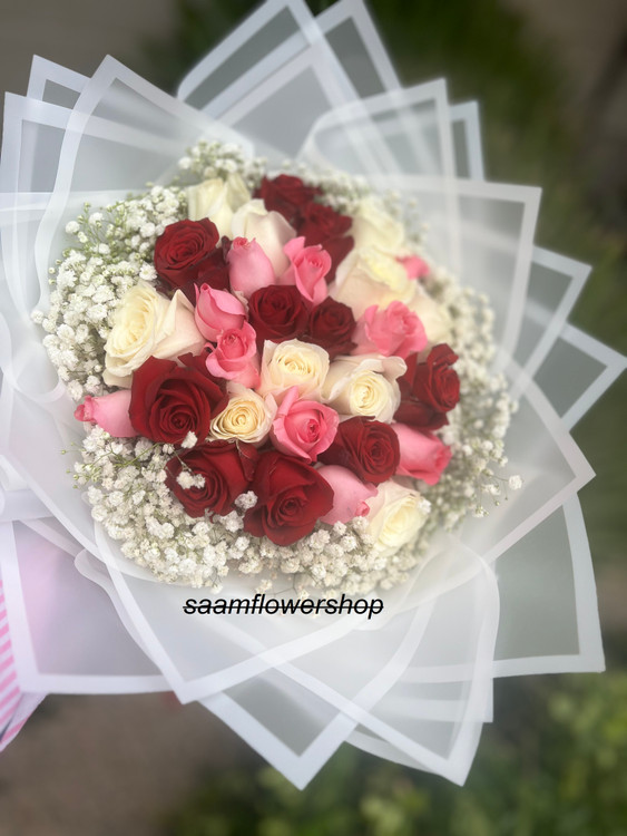 دسته گل با ترکیب رنگ های رز قرمز رز سفید و رز صورتی و حاشیه کار گل ژیپسوفیلیا