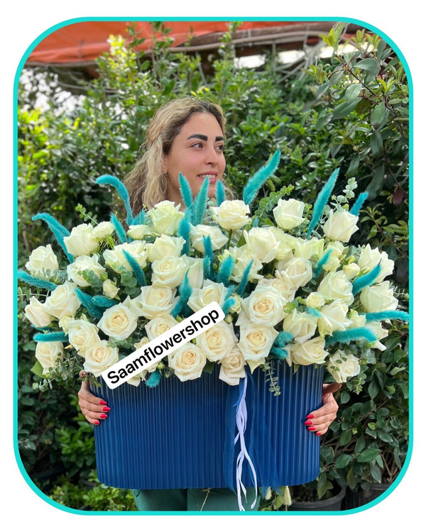 گل های رز سفید هلندی و رز مینیاتوری سفید داخل باکس گل سورمه ای