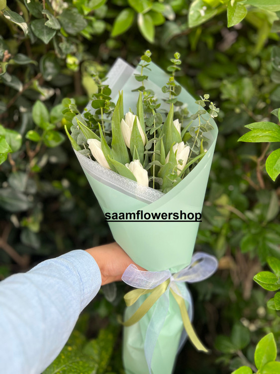 5 عدد لاله طبیعی سفید در دسته گل مینی