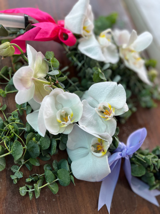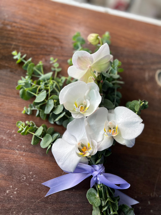 دسته گل با یک شاخه گل ارکیده طبیعی در رنگ بندی به همراه برگ اکالبپتوس