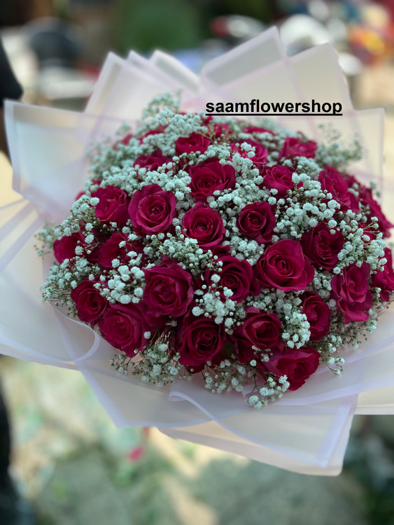 40 شاخه گل رزسرخابی هلندی و ژیپسوفیلیا سفید با دیزاین کاغذ سفید