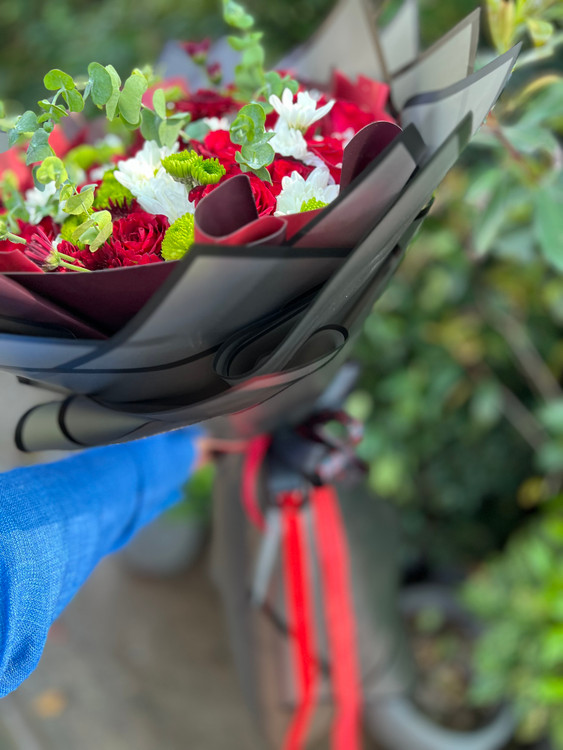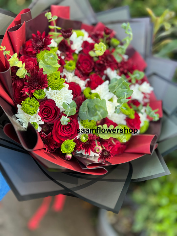 دسته گل با ترکیب رنگ های رز قرمز و داوودی های سفید و زرشکی و سبز