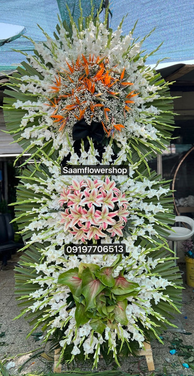 تاج گل سه طبقه با گل گلایل استرو آنتریوم و لیلیوم مصنوعی