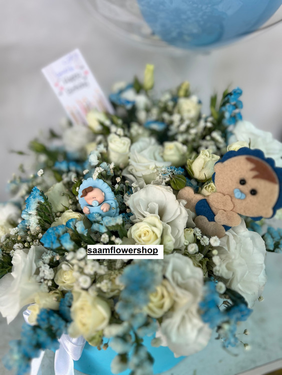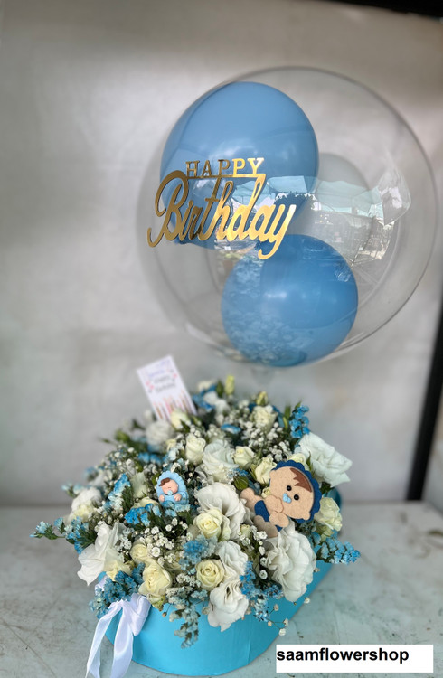 باکس گل آبی رنگ برای تولد بچه پسر همراه با بادکنک