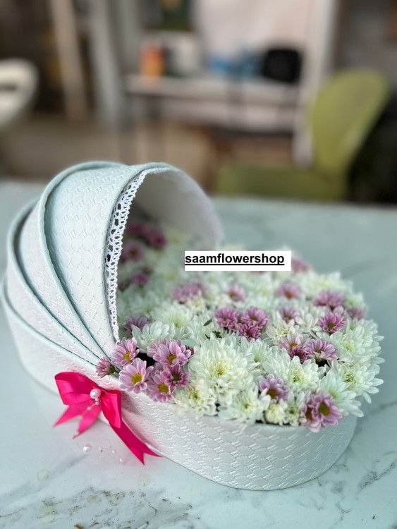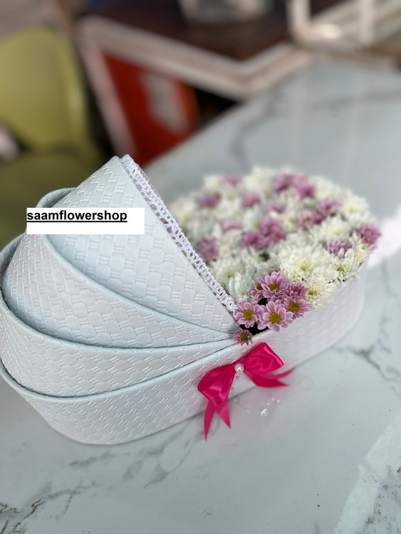 باکس گل به شکل کریر یا گهواره مناسب برای تولد نوزاد تازه متولد شده