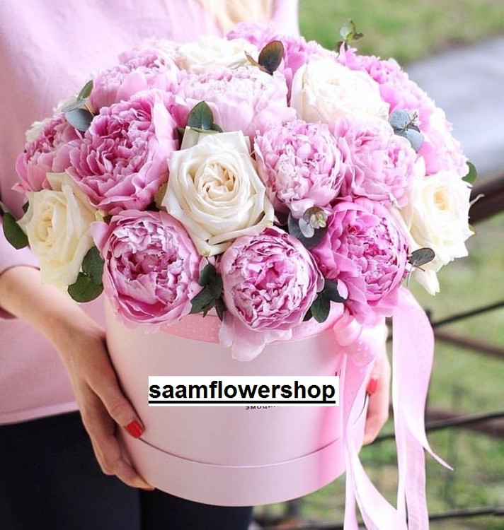 باکس گل پینترسی صورتی با گل پیونی و رز