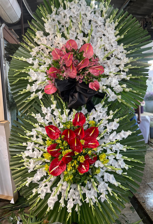 تاج گل دو طبقه با گل گلایل و آنتریوم قرمز