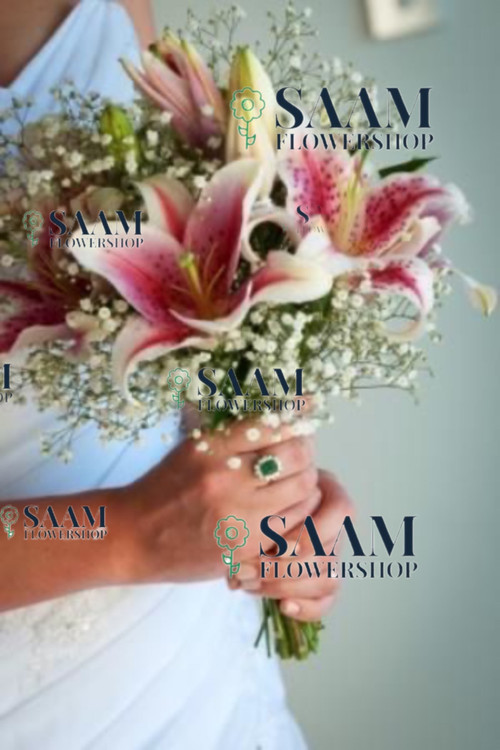 دسته گل ساده و مینیمال عروس با گل لیلیوم صورتی