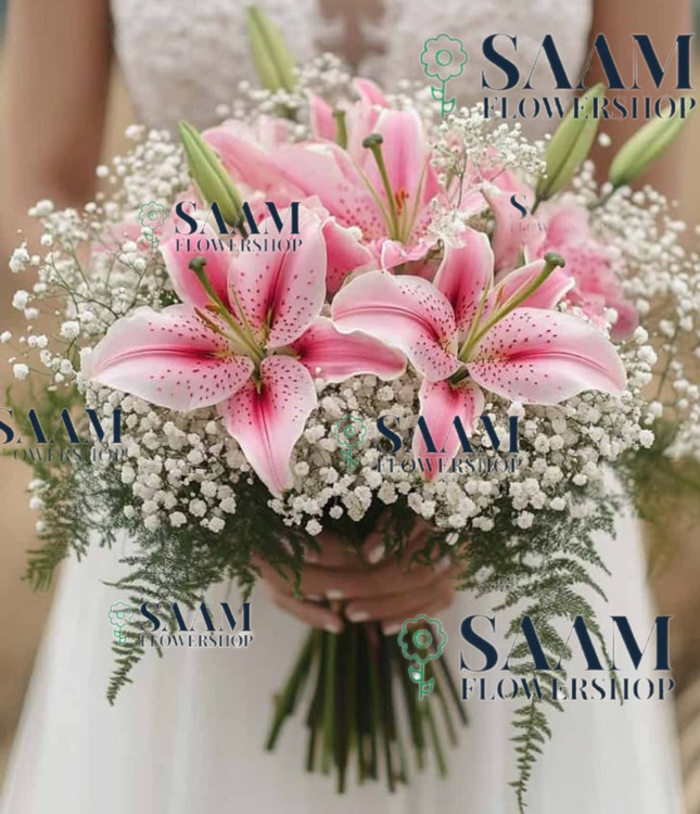 دسته گل عروس با گل اورینتال صورتی عطری