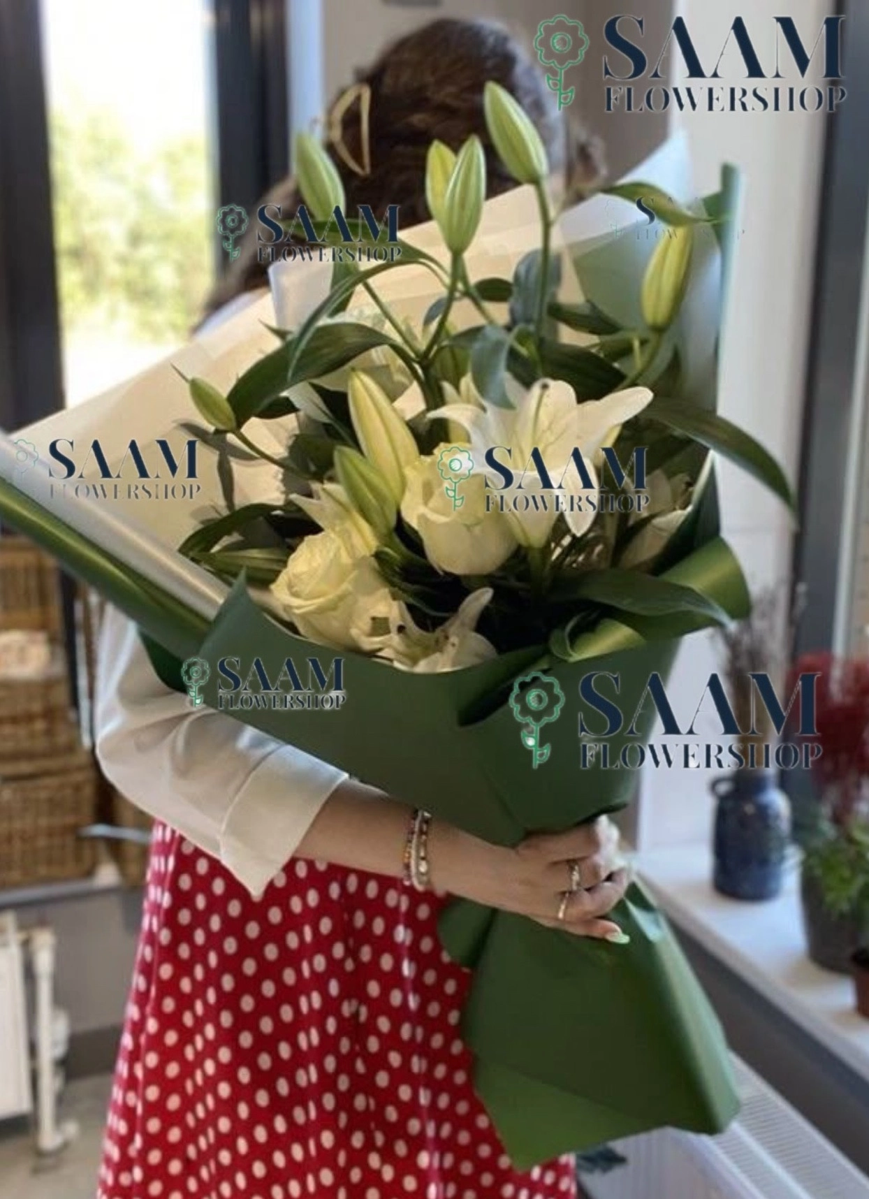 دسته گل لاکچری و خوشبو اورینتال سفید و رز سفید با کاغذ سبز