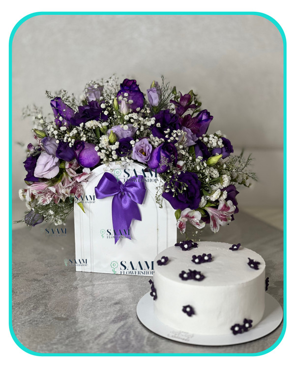 خرید پکیج تولدی شامل کیک تولد و باکس گل در رنگ بندی مورد نظر شما