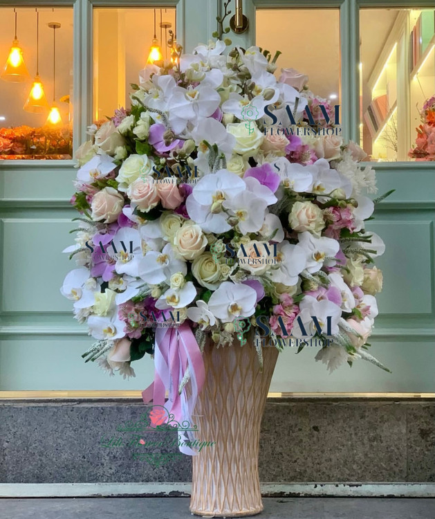 گل استفاده شده رز هلندی 40 عدد سفید و گلبهی و ارکیده 30 عدد به رنگ سفید و بنفش