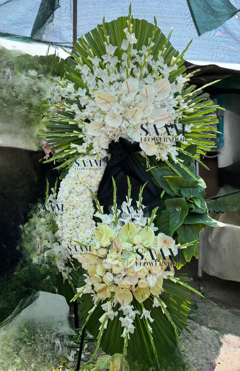 تاج گل دو طبقه ختمی با گل گلایل وآنتریوم سفید