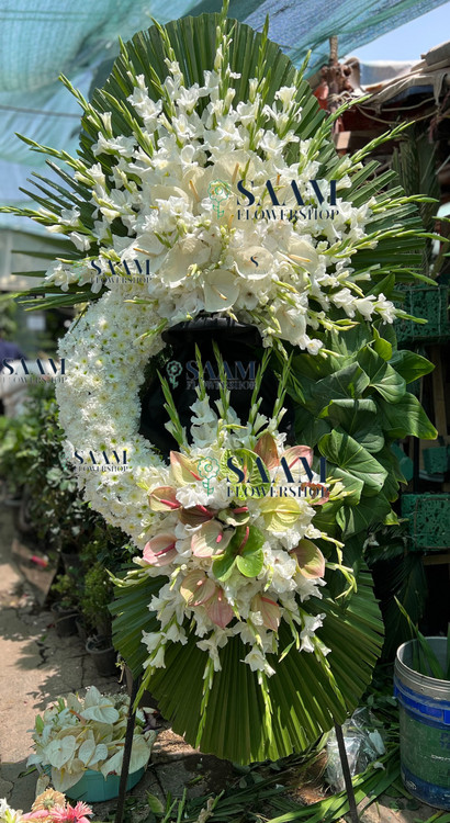 تاج گل دو طبقه ختمی با گل گلایل وآنتریوم سفید