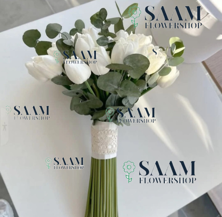 دسته گل عروس مصنوعی با گل لاله سفید مصنوعی لمسی و برگ اکالیپتوس مصنوعی