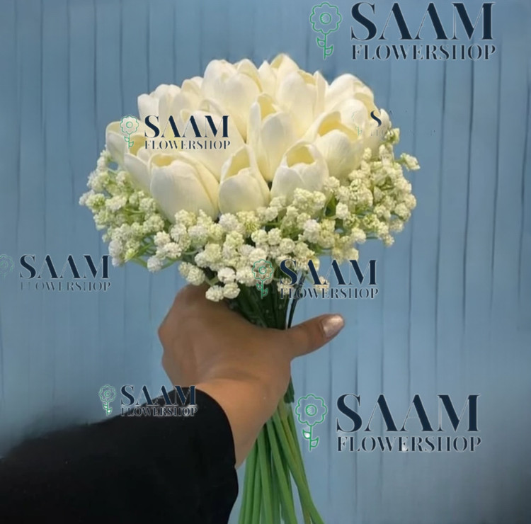دسته گل مصنوعی با 20عدد لاله مصنوعی سفید بههمراه ژیپسوفیلیا طبیعی اطرافش