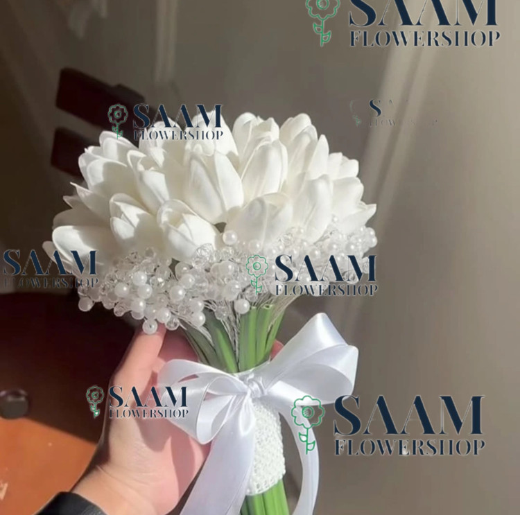 دسته گل مصنوعی با 20عدد لاله مصنوعی سفید به همراه شاخه های مرواریدی و کریستالی