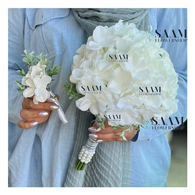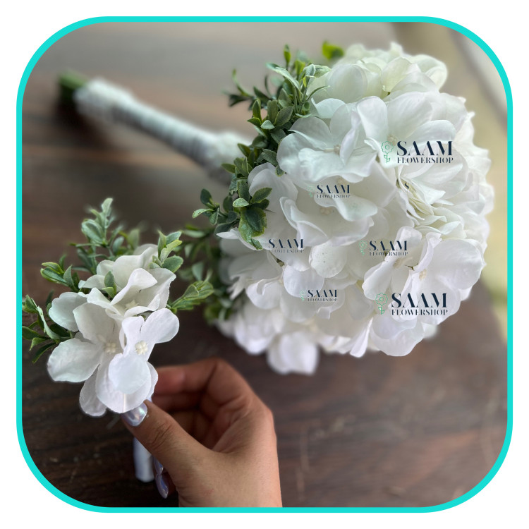 دسته گل عروس وگل جیب داماد با گل هورتانسیا مصنوعی